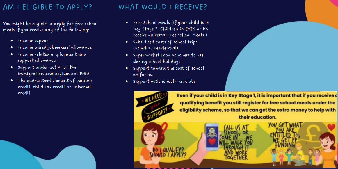 Although all children in Reception, Year 1 and Year 2 will now automatically receive free school meals, if your child would also be eligible for free meals due to the level of household income please ensure that you apply through this route as without your application, the school will not receive the associated Pupil Premium funding.